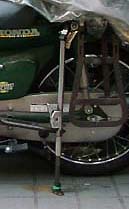 ※強化サイドスタンド…後付けで長さが調整出来る強化サイドスタンドのこと。市販のカブの場合、荷台やサイドキャリアに重量物を積むと、通常のサイドスタンドではもたないという。そのため、後付けでステンレス製の強化スタンドを装備することになるという。牛乳屋さんの配達で使用されるのが有名。スタンド自体の長さは、任意の長さに伸ばすことが出来る。